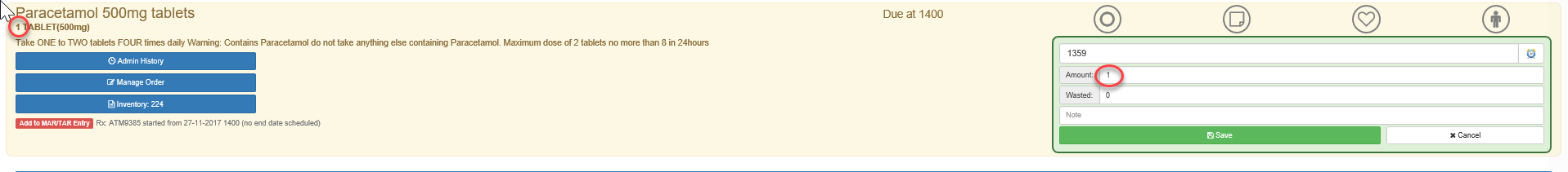5. Click on the green administered box to the right of the medication administered and enter the quantity of tablets administered