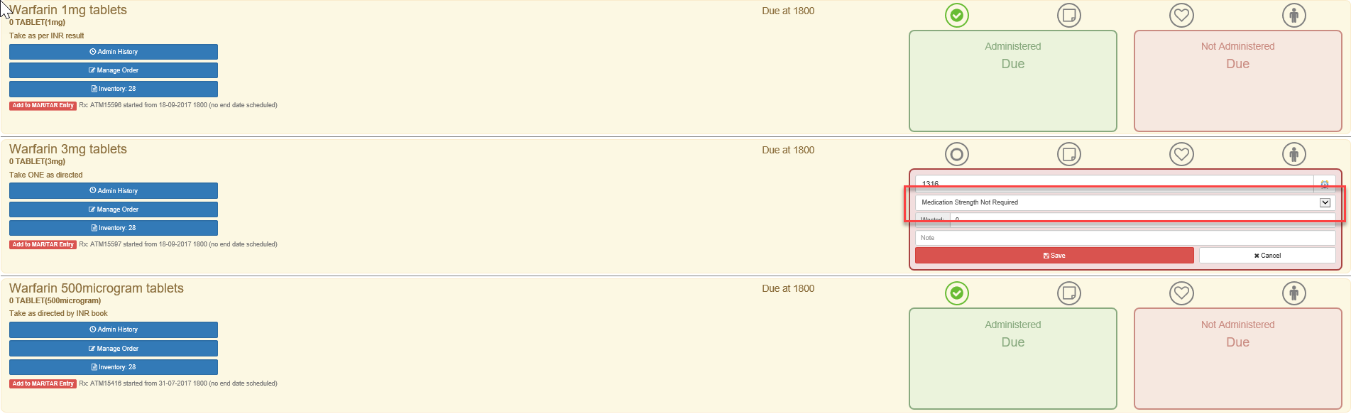 2. For Warfarin strengths not required for this administration, click 'not administered' and select 'medication strength not required'. See below Warfarin 3mg
