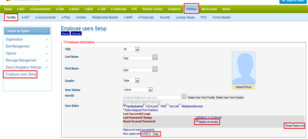 1) Click on Settings > Facility > Employee User set up > Search and Select The User you want to Change password.