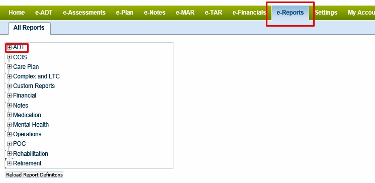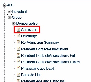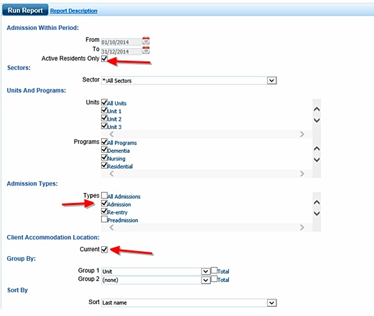 4) Set the parameters for your report, this should include if you want to look at active residents or search in a particular time frame. Select the specific admission types. Click the Run Report button once you have set all your parameters.