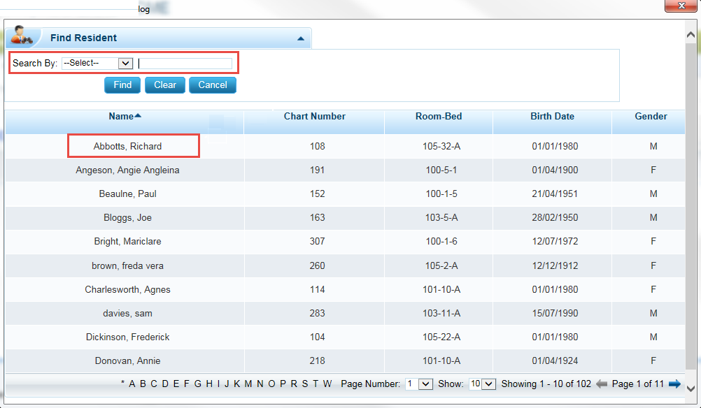 5) Click on the resident required or type the residents name in the search filter and click Find.