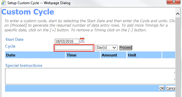 8) This should have opened a new page called a custom cycle. Enter how many days you want the cycle to repeat over. For instance Tramadol 1 in the morning 2 at night, I would want this to repeat every day so my cycle would run over 1 day. For Alendronic Acid a once a week tablet, this would need to repeat every 7 days. This is so you can specify which day the Alendronic acid needs to be given on.