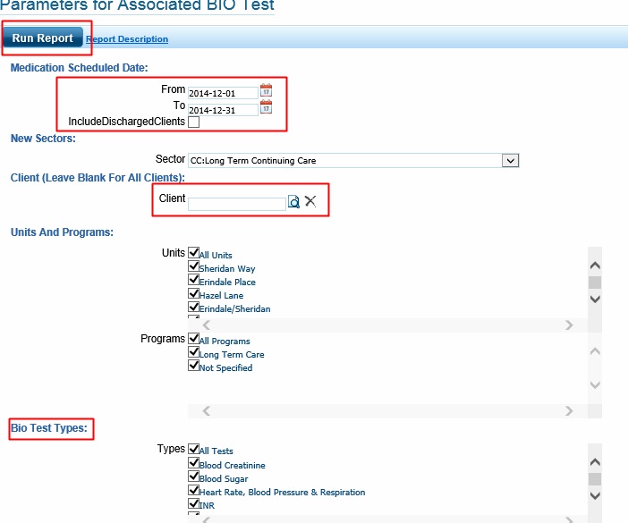 4) You can change the parameters of the report now. Change the dates for the report if needed and select the resident you want to search bio tests for. You can also select to search for a specific bio test by using the check boxes under bio test types. Once you have set all the parameters click on the Run Report button.