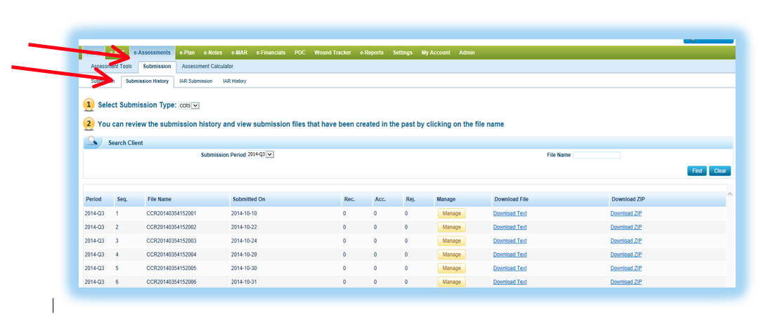 Select the applicable Submission Period and click “Find” then click the manage button next to the appropriate submission file you wish to manage.