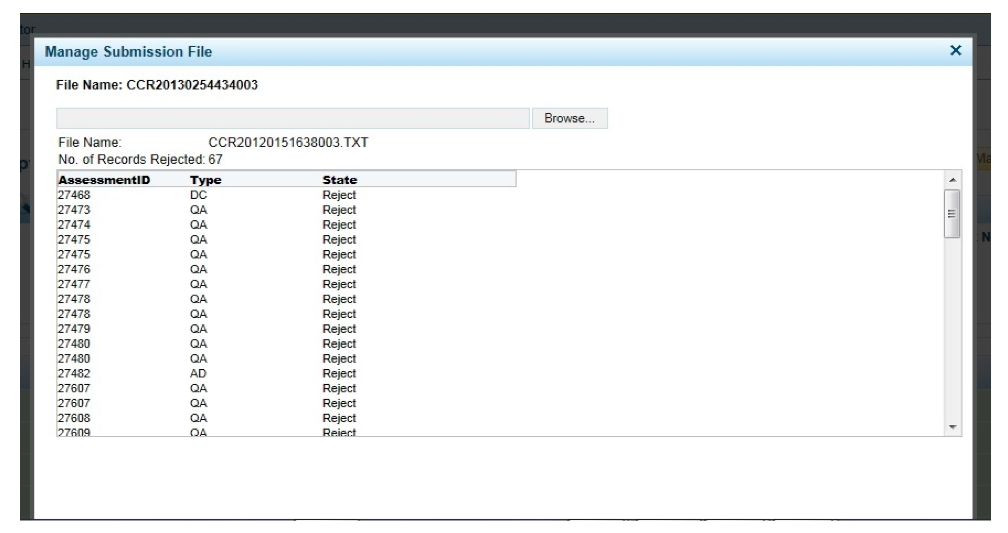 If you uploaded a valid file the following screen will display the status of each assessment and mark them appropriately as either “Accepted” or “Rejected”