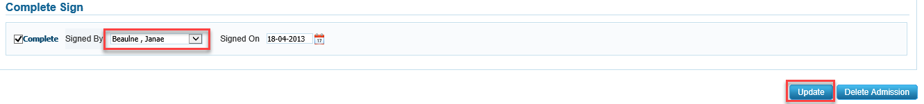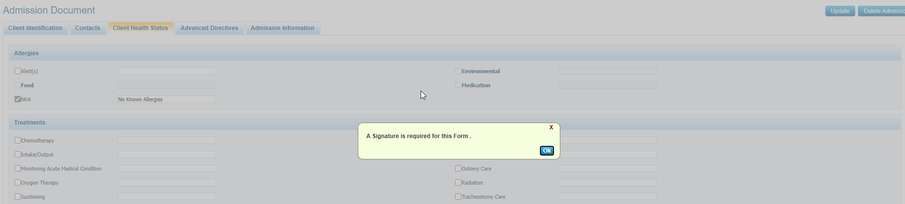 4) Click on the Client Health Status tab. If you get a message to say 'A Signature is required for this form', you must go to the admission information tab, enter your name in the complete sign section with todays date and then click update. You have to enter the signature before you can make any changes to the diagnoses or allergies.