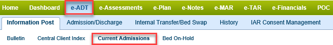 1) Click on e-ADT on the green bar, then click on Current Admissions on the white bar.