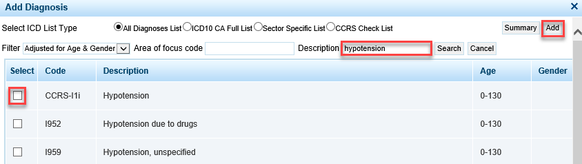 8) Use the description box to search for specific conditions. One you have found the correct diagnosis, tick the check box on the left hand side and then click the Add button.