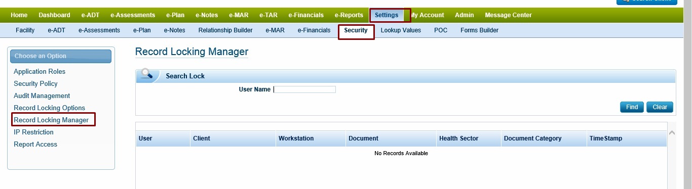 If there are open assessment or record you will see them listed with the resident name and the user who opened it. Click on the name you want to unlock. This action will unlock the record.