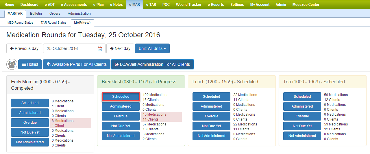 2) Click Scheduled under the desired round to show all residents with medications scheduled for that round. Remember, you can still administer overdue medications from previous rounds by clicking Overdue.