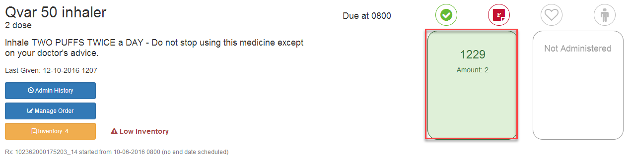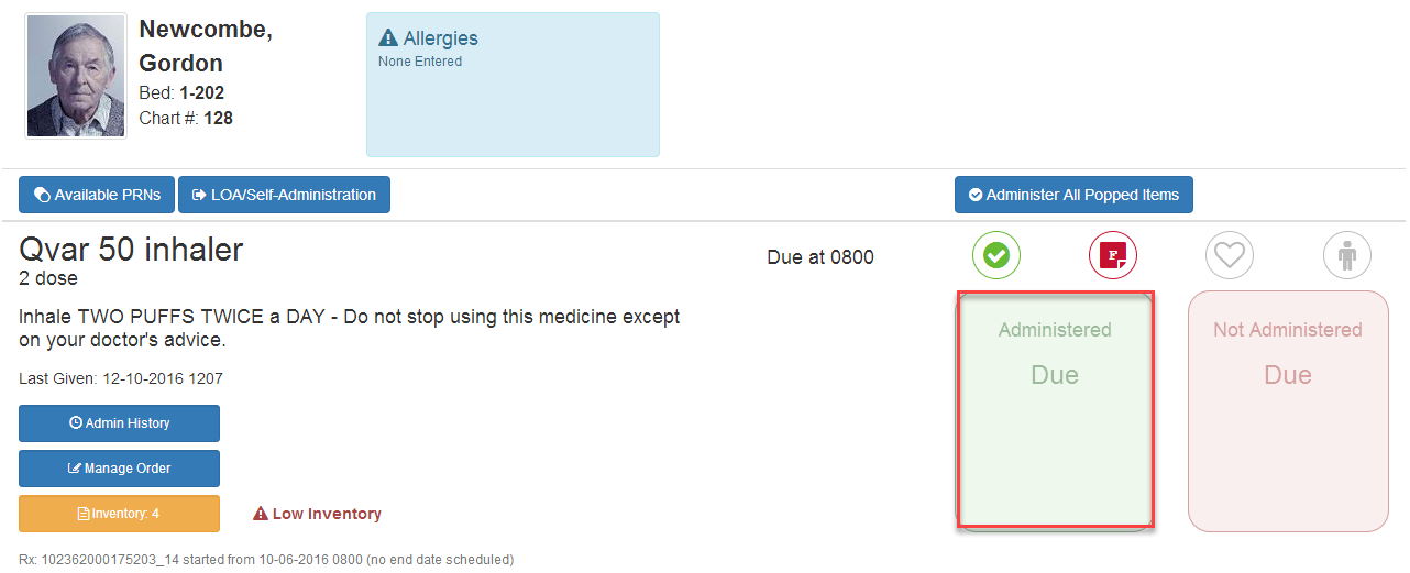 4) Next to the medication that you have given, click in the box under the administered column, it will turn green.