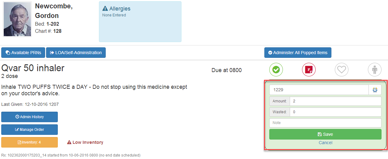 5) Enter the time of administration and amount given. If any medication is wasted, the amount can be entered in the bottom Wasted field. You must then type a reason for wastage in the fouth box down. Finally, click Save.