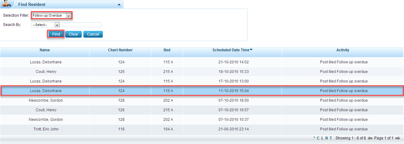 2) You can either use the Selection Filter to find specific task to complete from the down down list and click Find. Or you can click on a residents name to complete the activity.