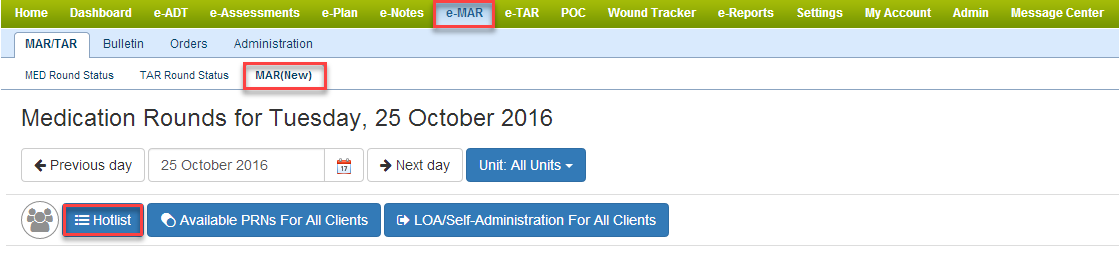 1) Click on the e-MAR tab, then click on the MAR tab, finally click on the yellow Hotlist button.