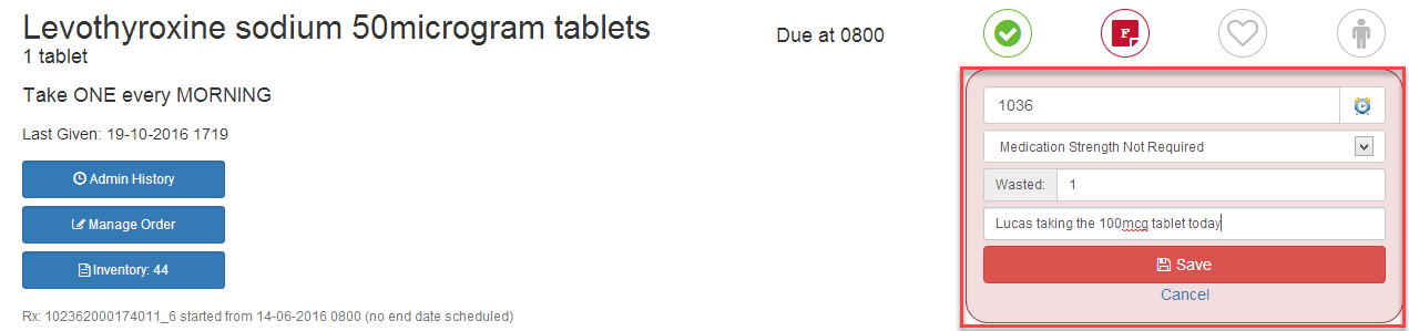 2) Enter the wasted amount in the box labelled Wasted. For example if 15ml has been wasted, simply enter 15. Select the reason for non-administration from the dropdown menu. In the box beneath add a reason for wastage, a reason is mandatory when wasting. Make sure the amount given and the time of administration are correct. Finally, click Save.