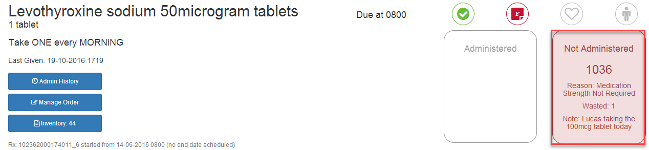 1) On the MAR page in the appropriate round, next to the medication that you have wasted, click in the box under the Not Administered column.