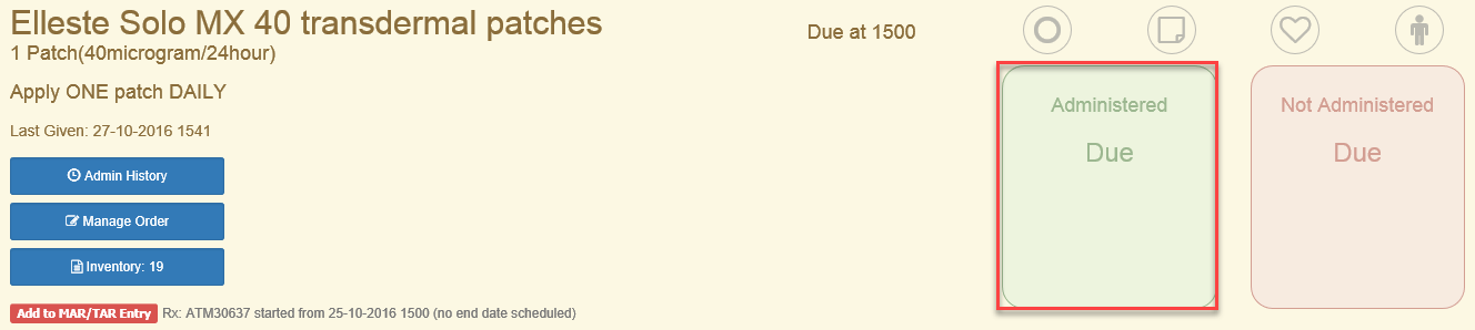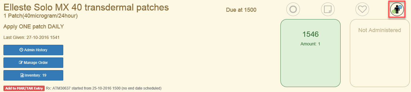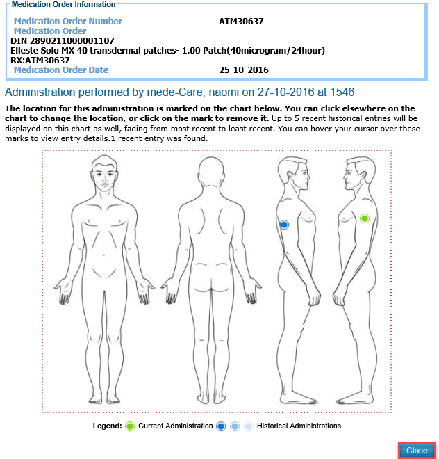 You can hover of the Blue and Green dots to find out when the medication was administered and by whom. Click Close to go back to the resident's MAR.