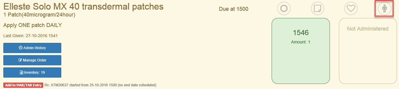 1) The Body Map can only be used whilst in a residents MED round. Before we can select a location on the body we must first administer the medication. Click on the Administered box.