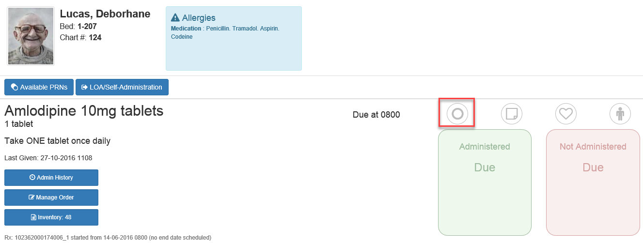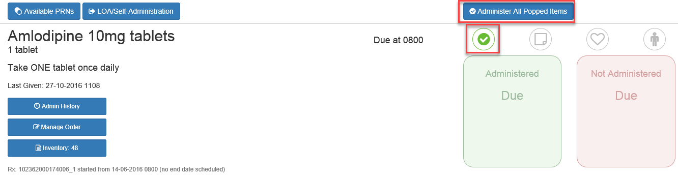 2) Once you have clicked on the circle and marked the medication as popped this will fill with a green tick. An item can be un-popped if ticked by mistake. You can now click on the Administer All Popped Items to administer all medications that have been marked as popped.