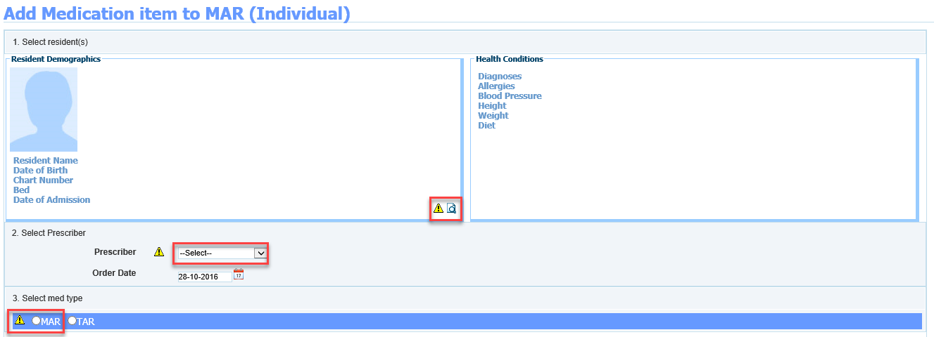 2) To complete section 1 click on the magnifying glass to select your resident, then for section 2 select Homely Remedy from the prescriber list and finally click on MAR for section 3.