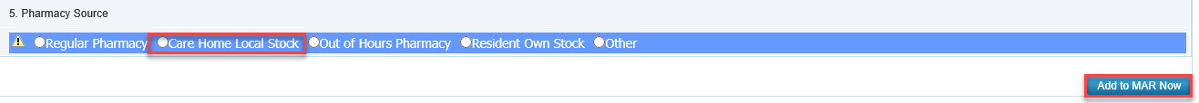 6) Select a pharmacy source, and then click Add to MAR Now. This will add a record of administration for this Homely Remedy if its a STAT otherwise this will be added to the Residents MAR or to Receive Orders to be booked in.