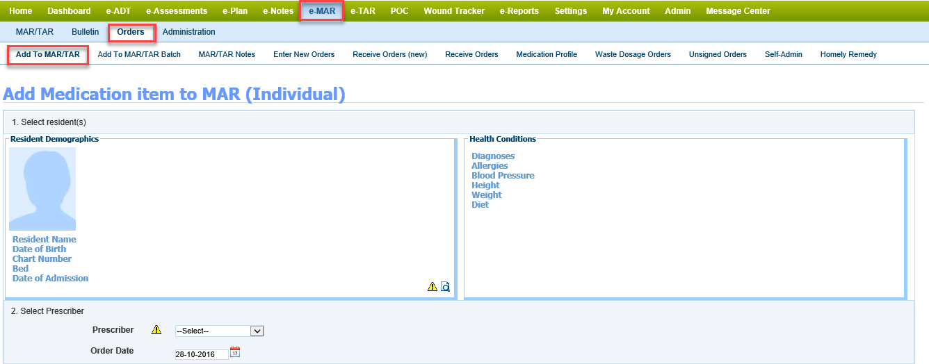1) Click on e-MAR on the green bar then click on Orders on the blue bar. Finally make sure you are on Add To MAR/TAR.