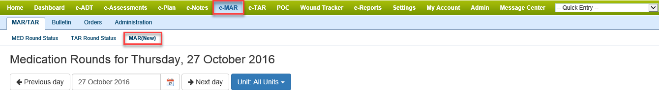 1) Click on e-MAR on the green bar, then click on MAR on the white bar.