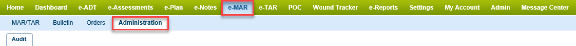 1) Click on e-MAR on the Green bar, then click on Administration on the blue bar.