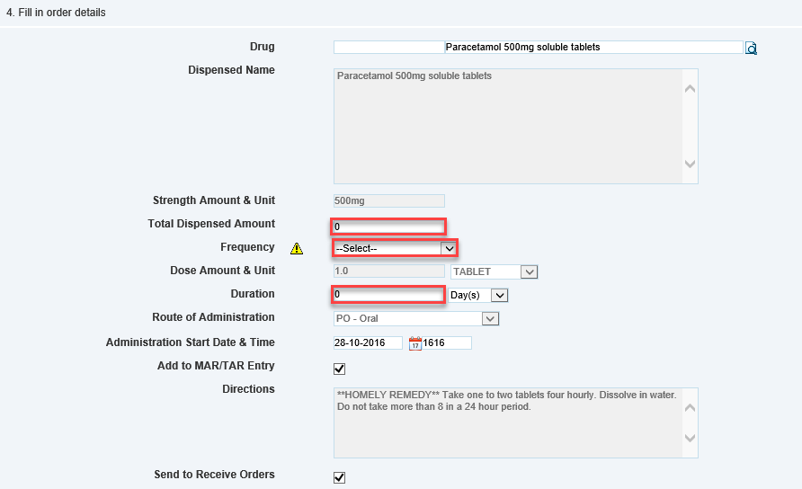 Once you are in add to MAR and have selected your resident and medication, set the frequency to STAT if this medication is to be given once only and enter a dispensed amount (how much you are giving to the resident); finally change the duration to 1 day. Otherwise if the homely remedy is to be scheduled or given as a PRN select the corresponding Frequency and enter the dispensed amount as the quantity you have reserved for this administration for the full duration.